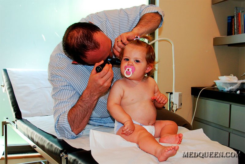 Острый отит характеризуется внезапным началом: ребенок становится беспокойным, кричит, нарушается аппетит, повышается температура тела, нарушается сон. При легком надавливании на козелок больного уха ребенок вздрагивает и начинает кричать. Позднее появляются головная боль, жидкий стул, рвота.